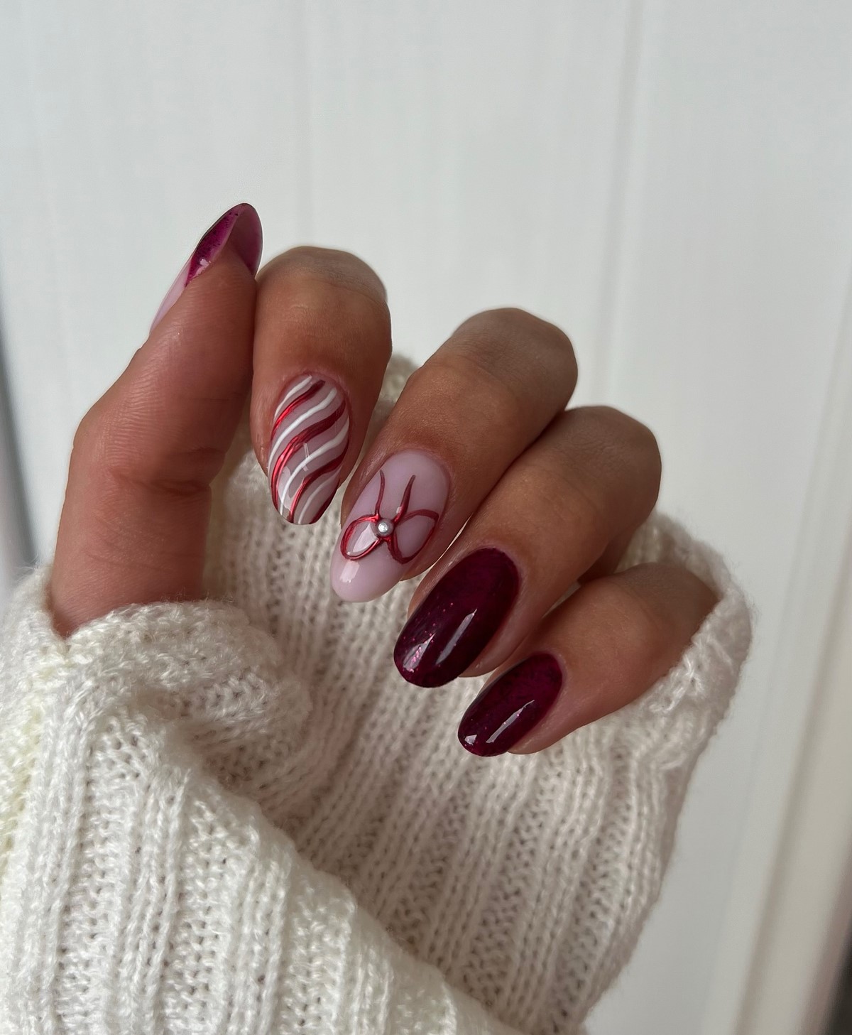 Объемные банты на ногтях — это воплощение праздничной романтики и женственности. Этот дизайн выполняется с помощью гель-лака и специальной техники лепки, создающей эффект настоящего атласного банта на ногтевой пластине. Чаще всего банты размещают на одном-двух акцентных ногтях, оставляя остальные в однотонном покрытии бордового, изумрудного или классического красного оттенка. Такой маникюр идеально подходит для тех, кто хочет добавить в образ нотку игривости и при этом сохранить элегантность.
