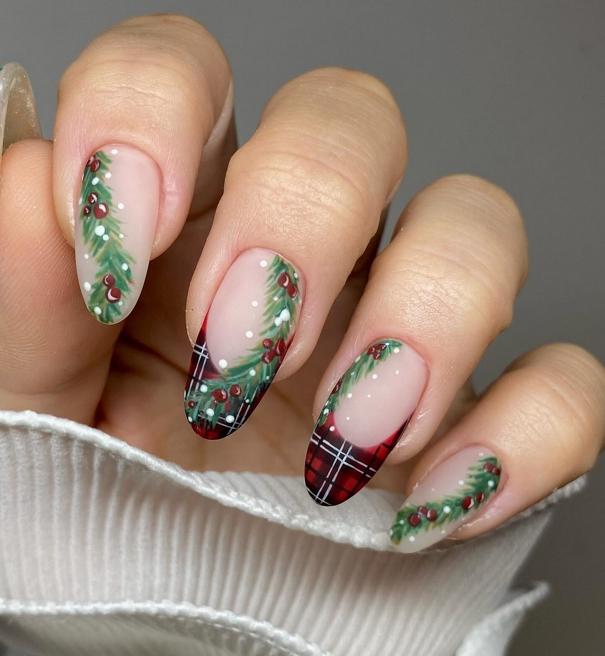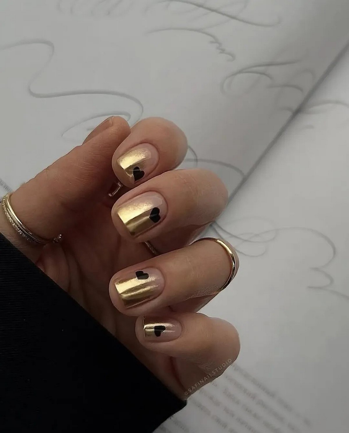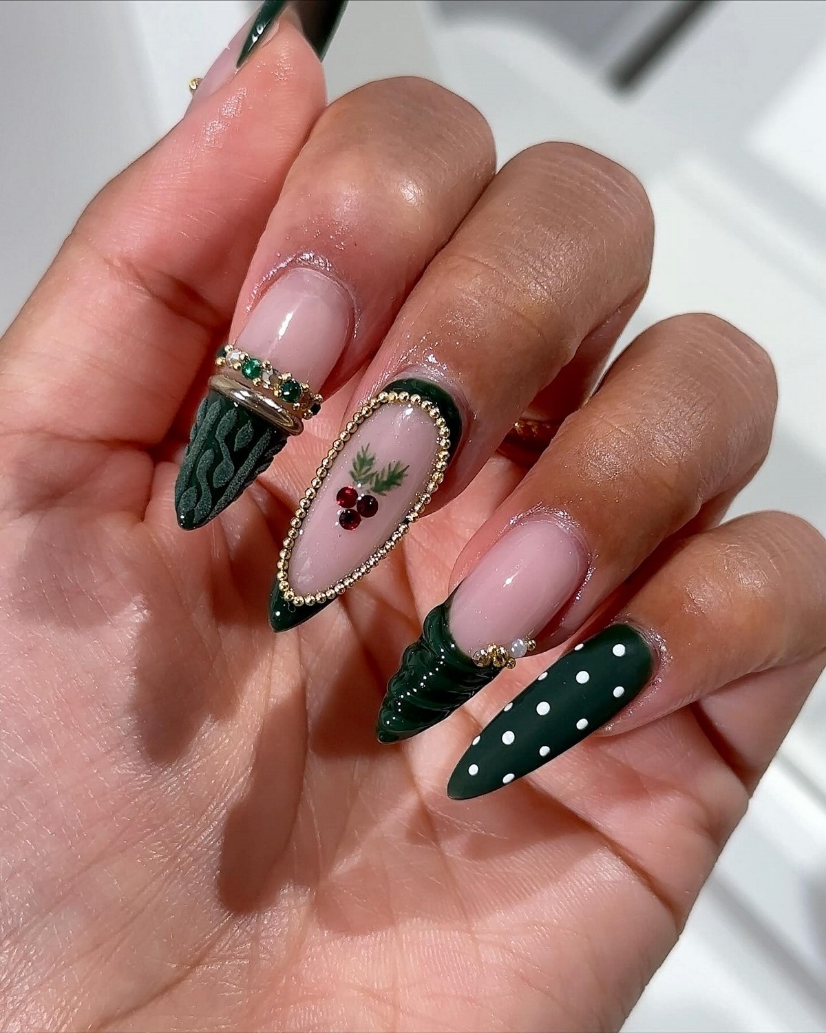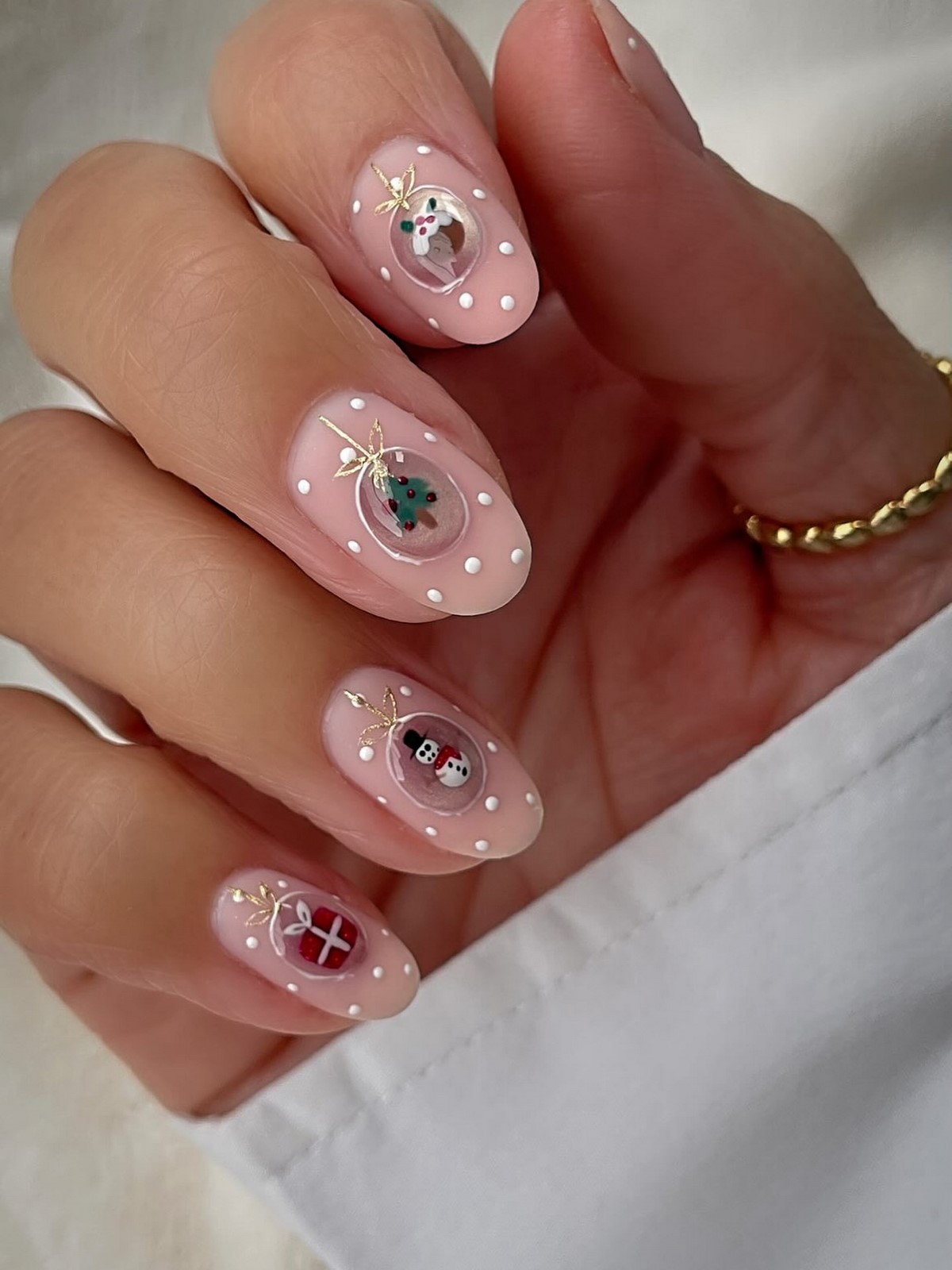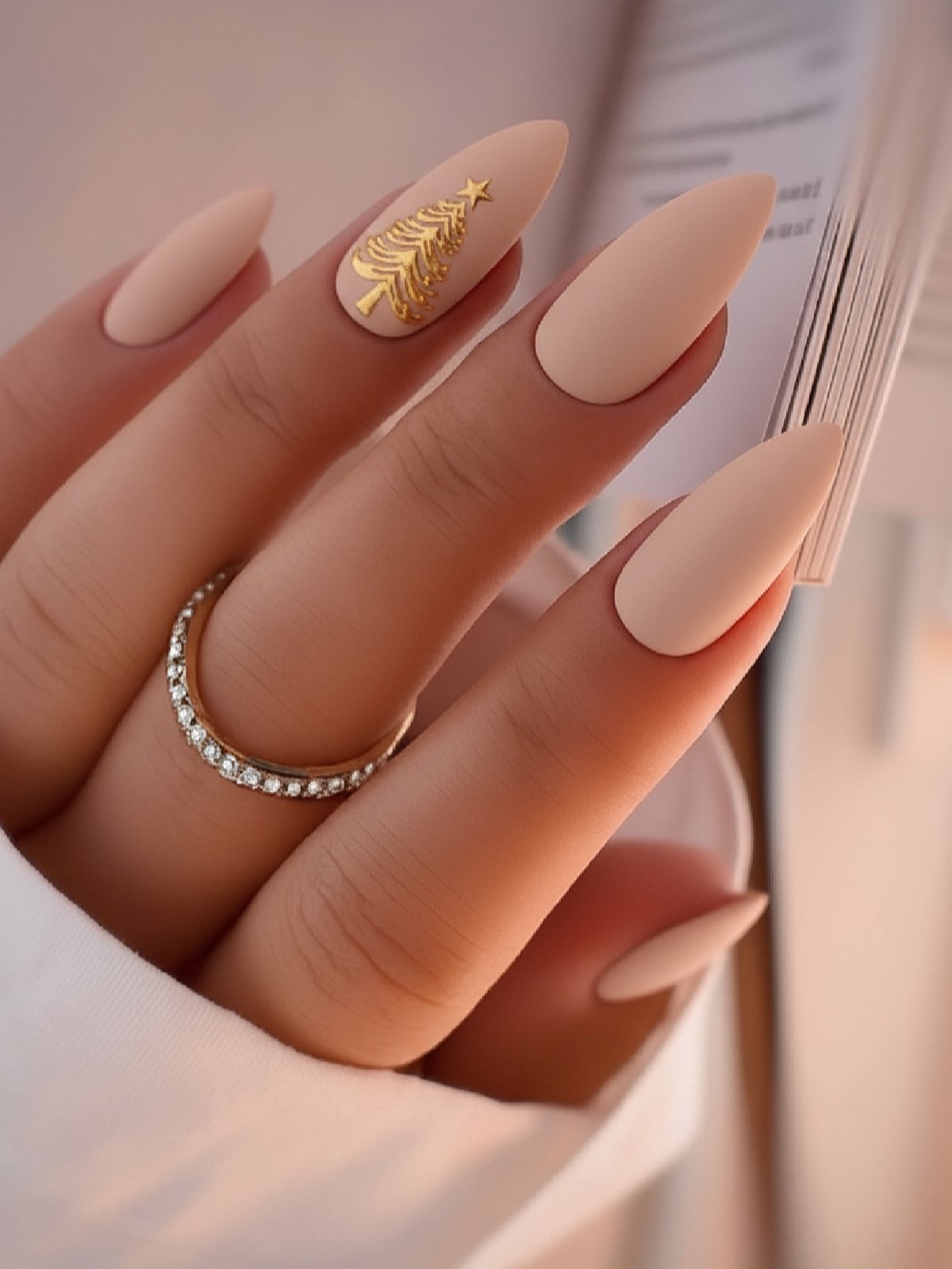 Для тех, кто предпочитает сдержанность и элегантность, идеальным вариантом станет нюдовый маникюр с праздничным акцентом. Нежная бежево-розовая или молочная основа на всех ногтях дополняется одним акцентным пальцем — чаще всего безымянным, — на котором размещается миниатюрная золотая елочка. Ель может быть выполнена тонкими линиями гель-лака, золотой фольгой или выложена мелкими стразами. Такой дизайн универсален, не перегружает образ и позволяет чувствовать себя комфортно в любой ситуации, сохраняя новогоднее настроение.