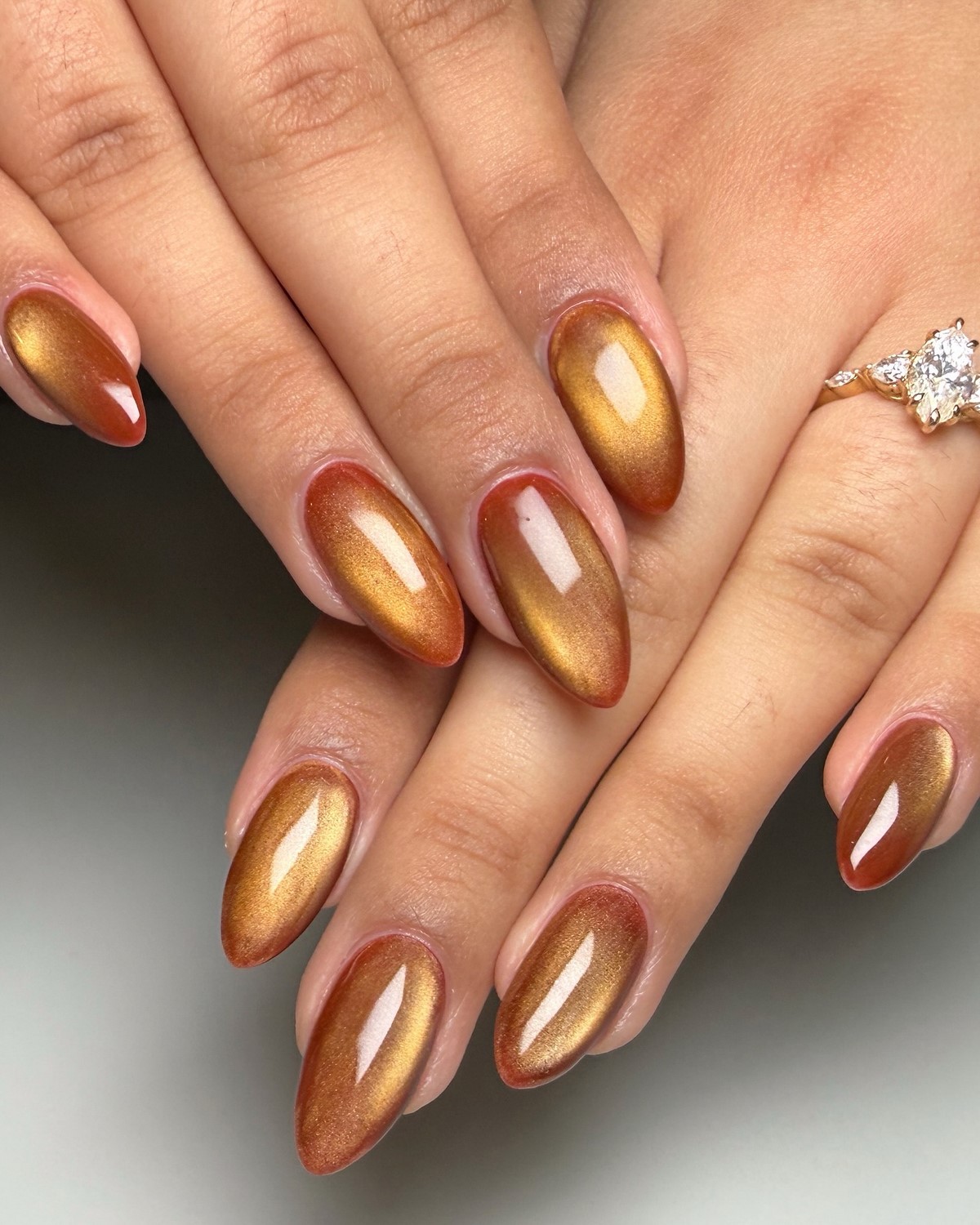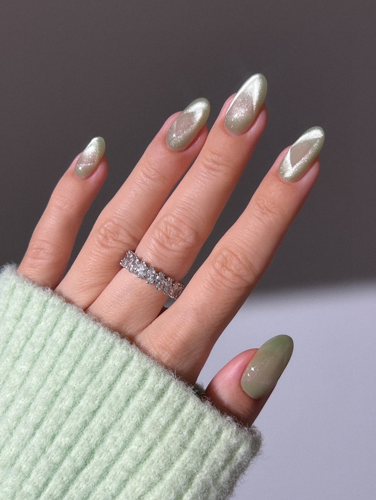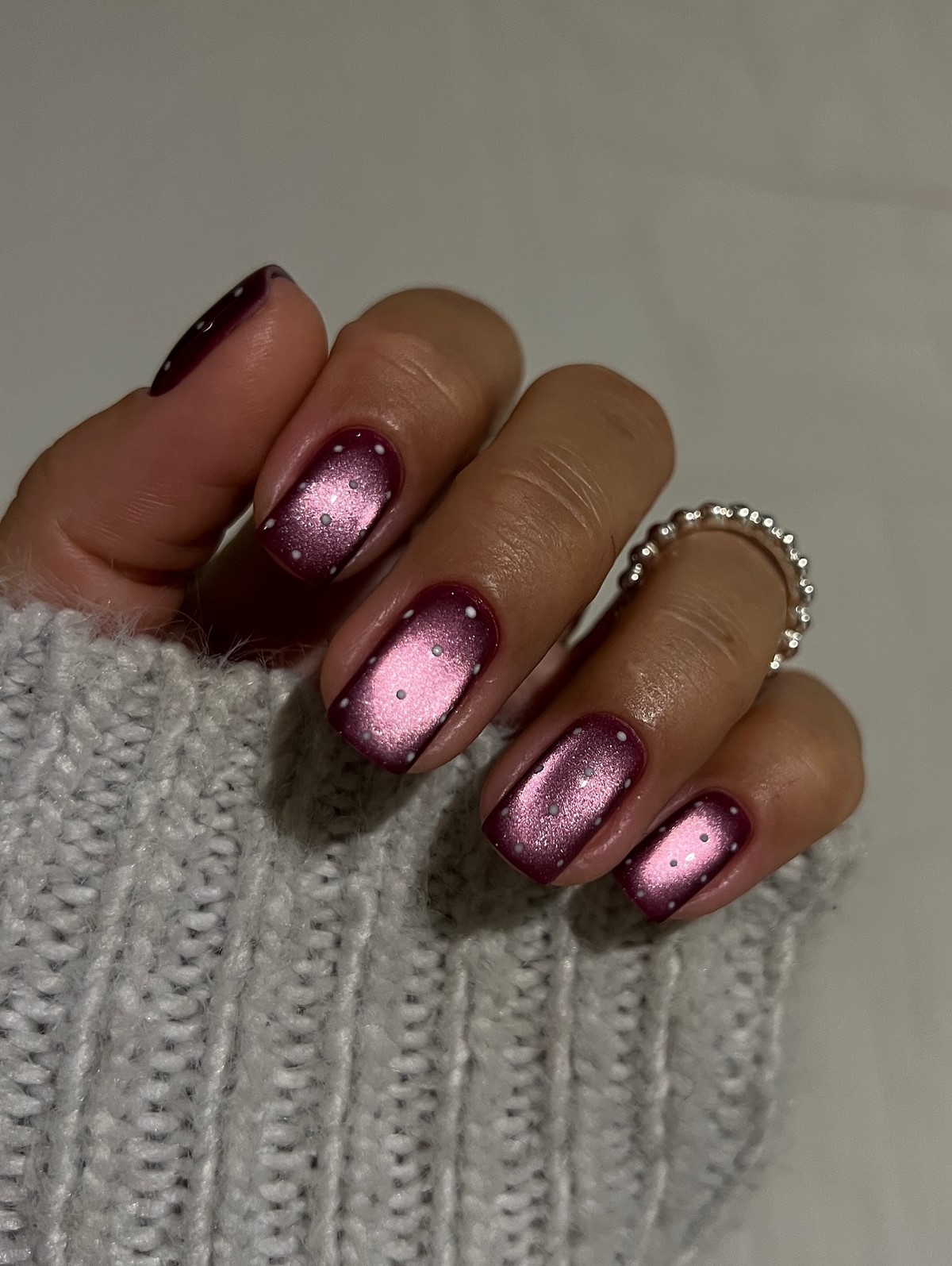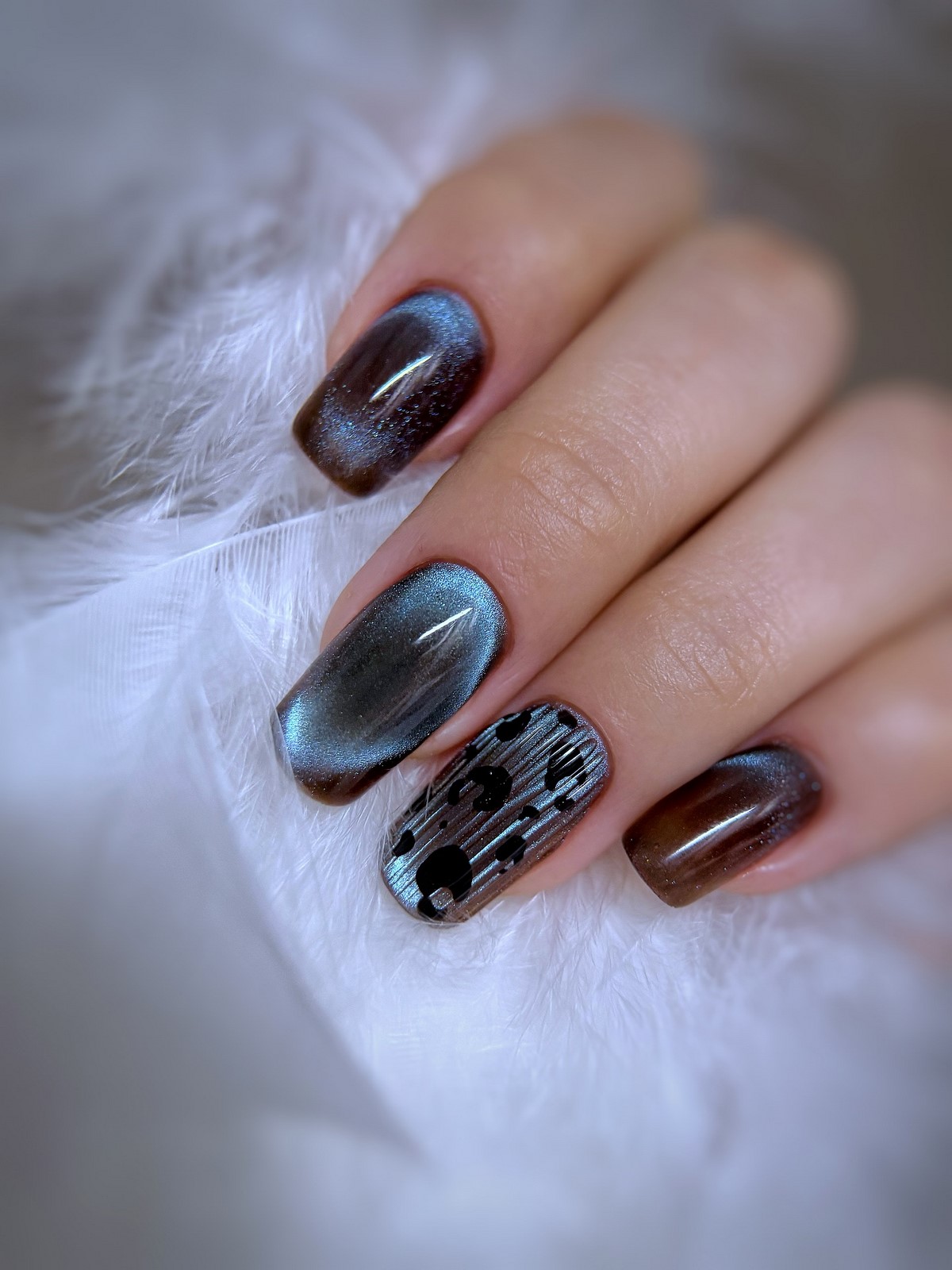 Магнитный эффект cat eye остается одним из самых востребованных вариантов для праздничного маникюра, но в 2026 году он получает новое прочтение. Глубокий сапфировый, изумрудный или винный оттенок с характерным световым бликом дополняется деликатным горохом на одном-двух пальцах. Горошины выполняются точечной техникой с использованием золотого или серебряного пигмента, создавая интересный контраст между мистическим сиянием cat eye и игривым ретро-принтом. Этот дизайн универсален и подходит как для коротких, так и для длинных ногтей.