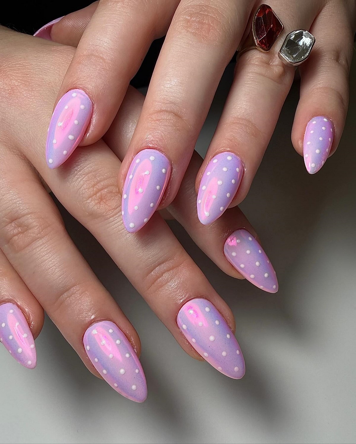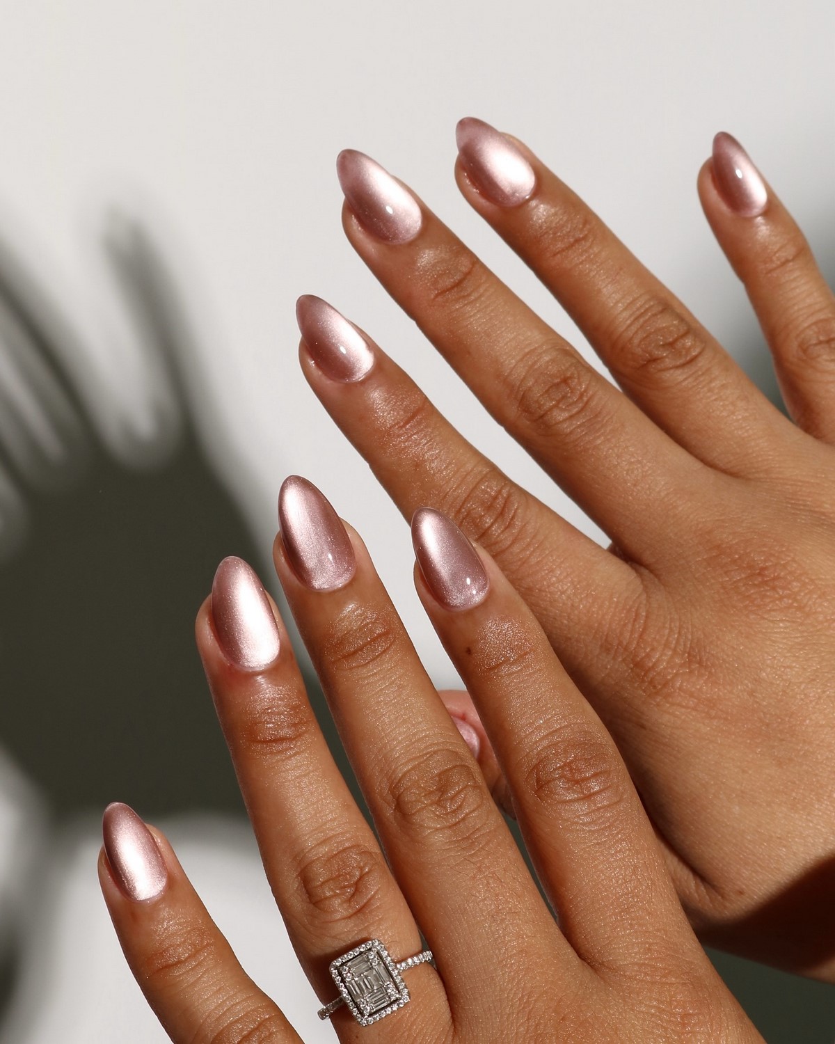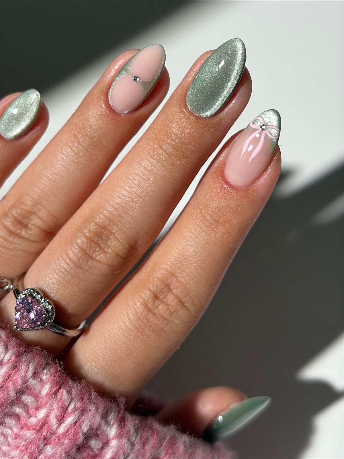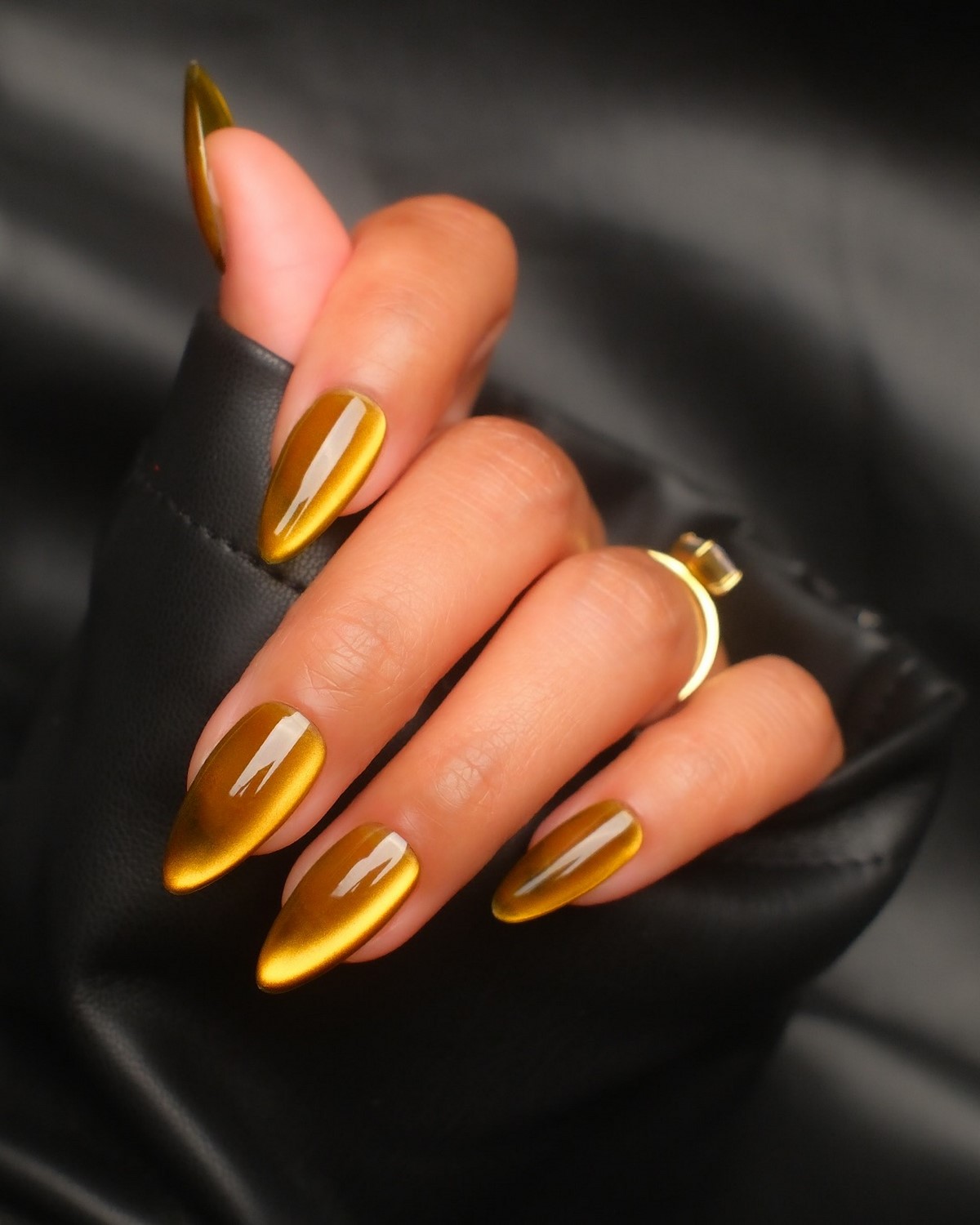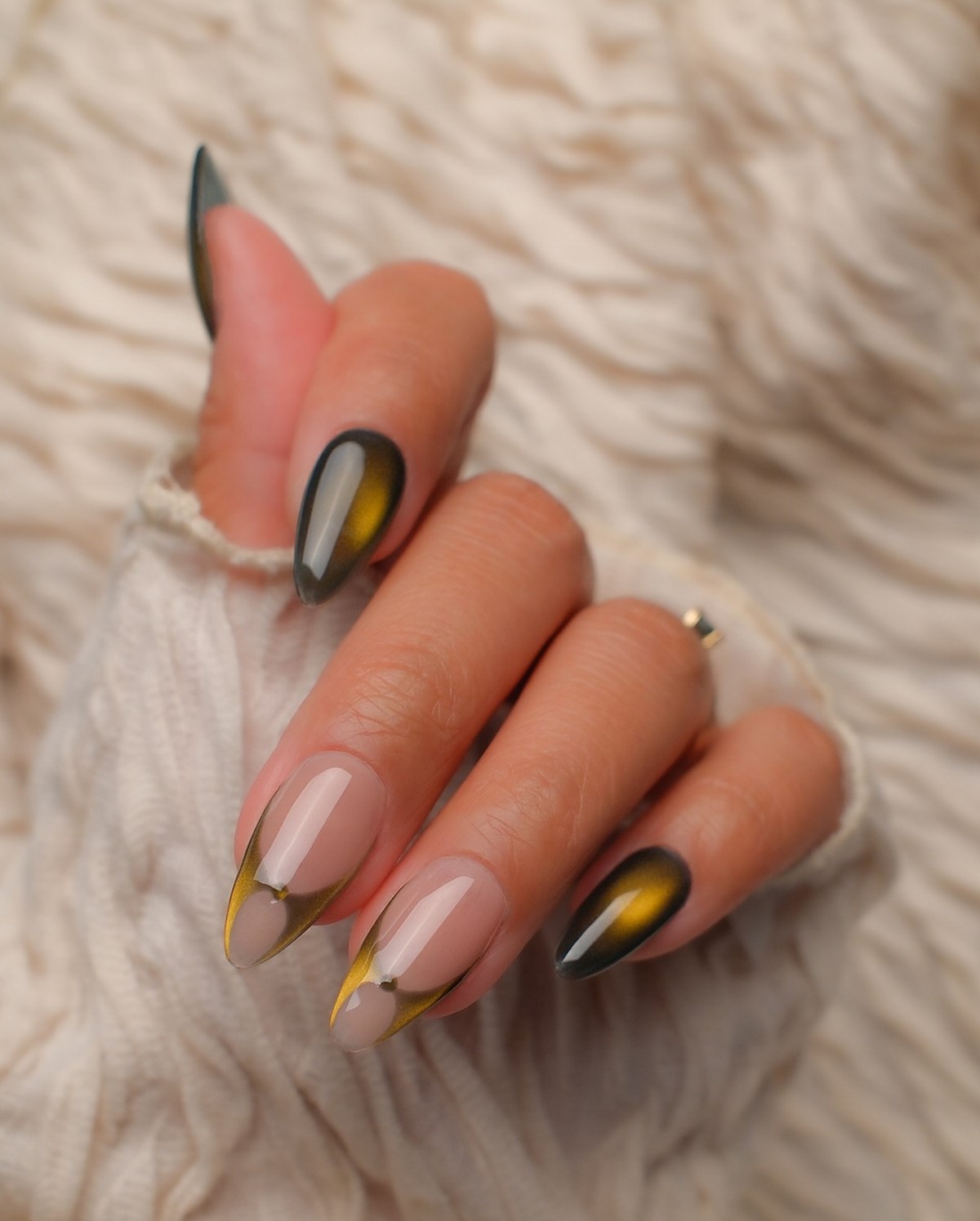 Магнитный эффект cat eye остается одним из самых востребованных вариантов для праздничного маникюра, но в 2026 году он получает новое прочтение. Глубокий сапфировый, изумрудный или винный оттенок с характерным световым бликом дополняется деликатным горохом на одном-двух пальцах. Горошины выполняются точечной техникой с использованием золотого или серебряного пигмента, создавая интересный контраст между мистическим сиянием cat eye и игривым ретро-принтом. Этот дизайн универсален и подходит как для коротких, так и для длинных ногтей.