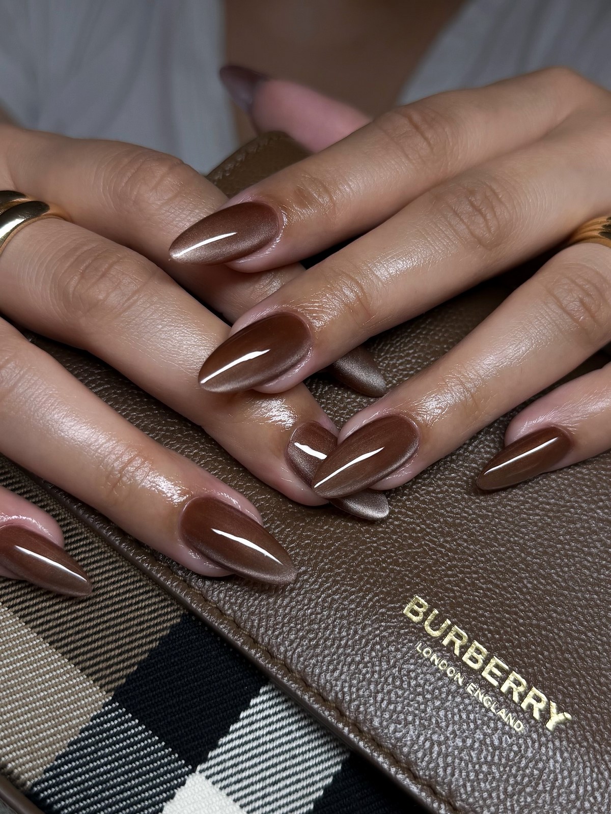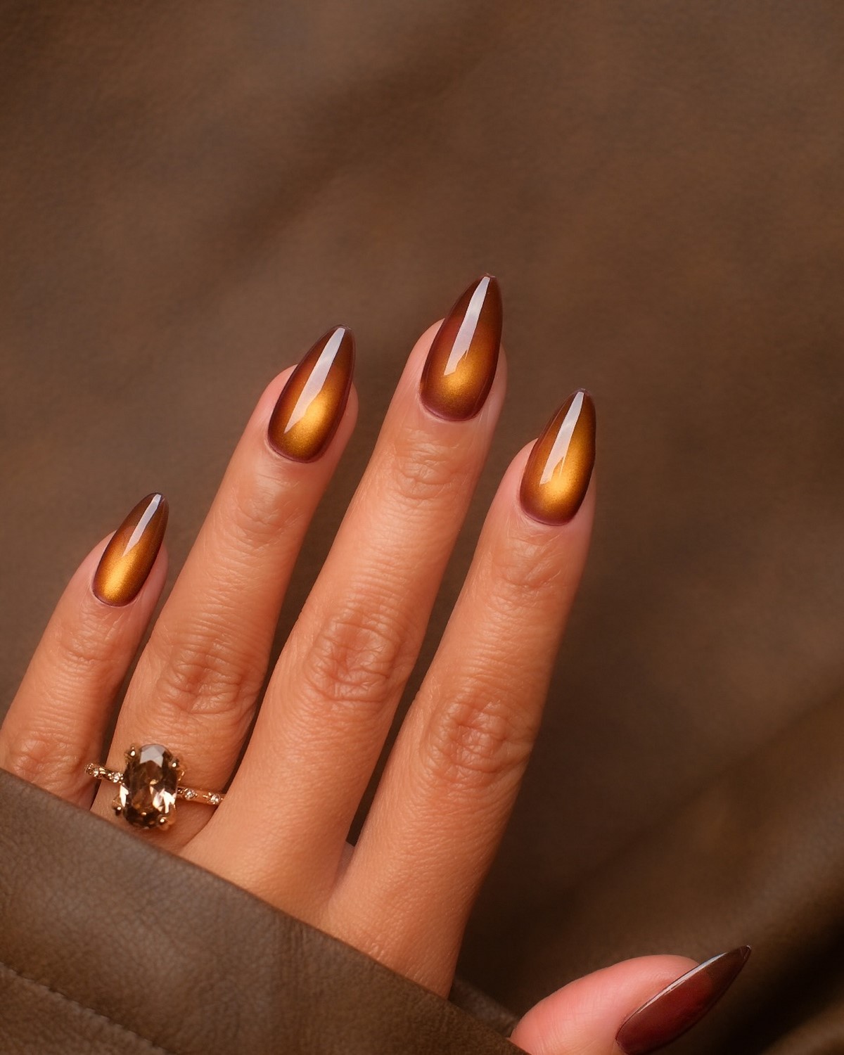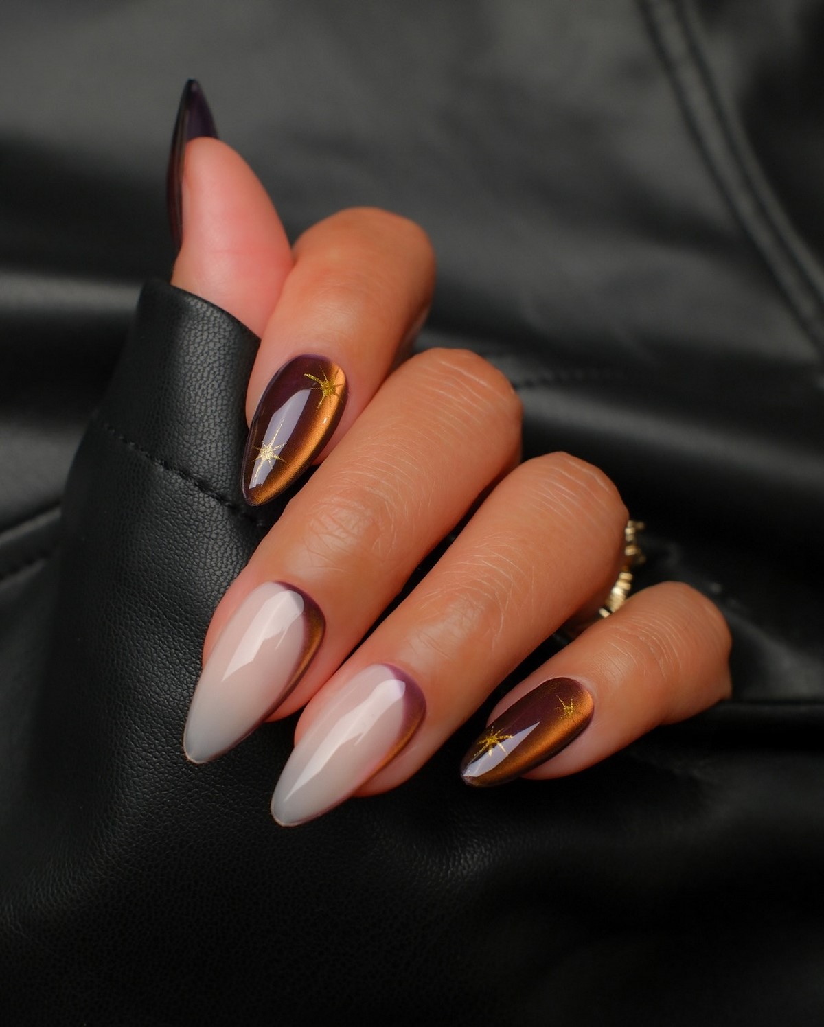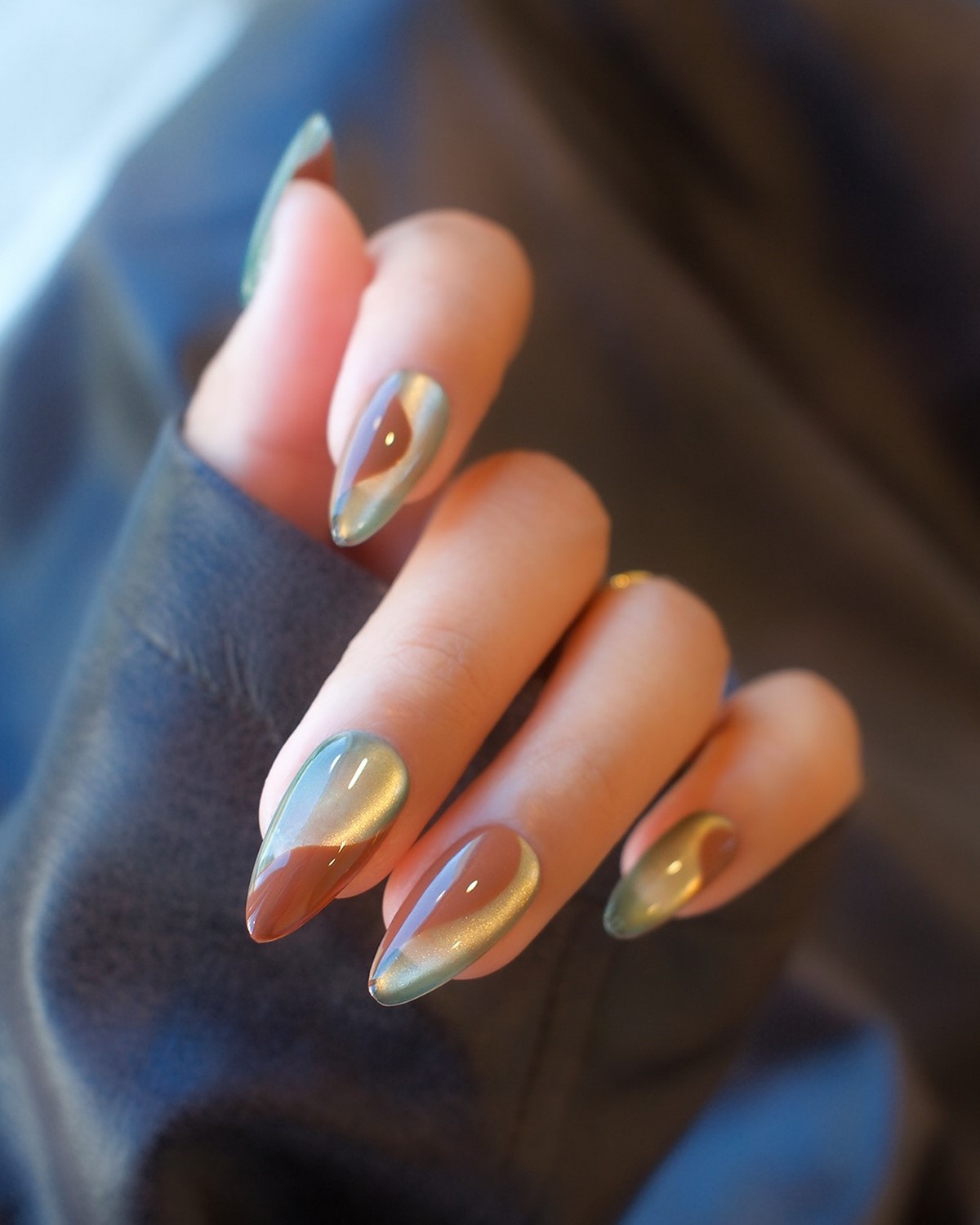 Магнитный эффект cat eye остается одним из самых востребованных вариантов для праздничного маникюра, но в 2026 году он получает новое прочтение. Глубокий сапфировый, изумрудный или винный оттенок с характерным световым бликом дополняется деликатным горохом на одном-двух пальцах. Горошины выполняются точечной техникой с использованием золотого или серебряного пигмента, создавая интересный контраст между мистическим сиянием cat eye и игривым ретро-принтом. Этот дизайн универсален и подходит как для коротких, так и для длинных ногтей.