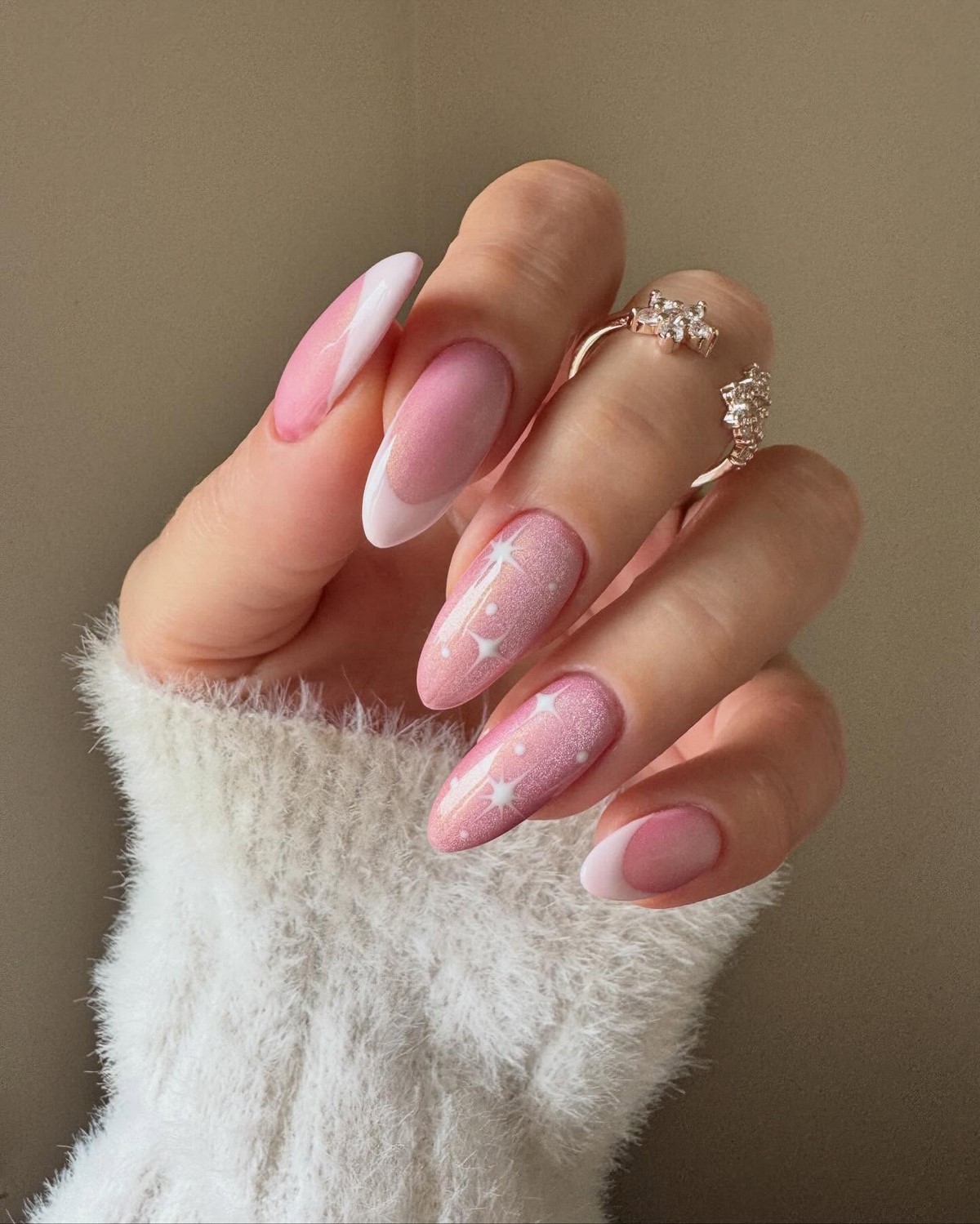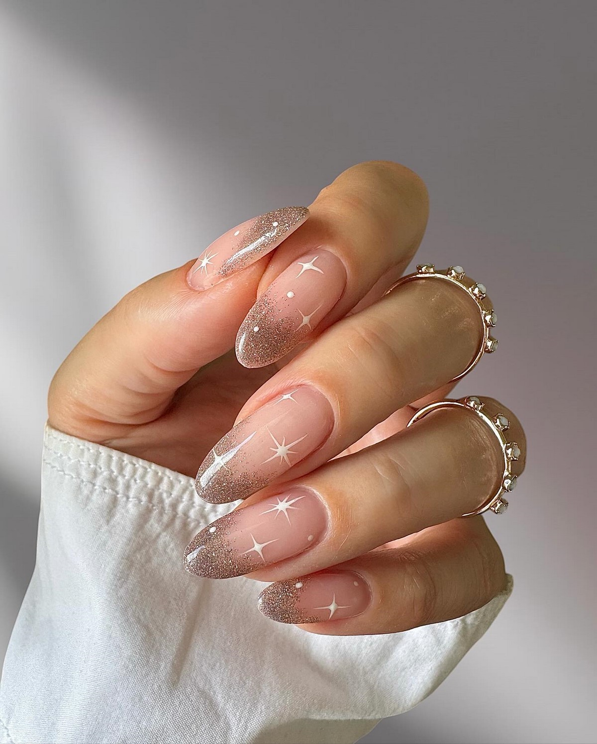 Звездный маникюр — это квинтэссенция новогоднего настроения без излишней детализации. В 2026 году актуальны лаконичные геометричные звезды, выполненные тонкими линиями золотого или серебряного цвета на темной основе — черной, темно-синей или графитовой. Альтернативный вариант — объемные звезды из страз или фольги, размещенные на одном акцентном ногте. Важно не перегрузить дизайн: максимум две-три звезды на всей руке создают эффект ночного неба и смотрятся стильно и современно.