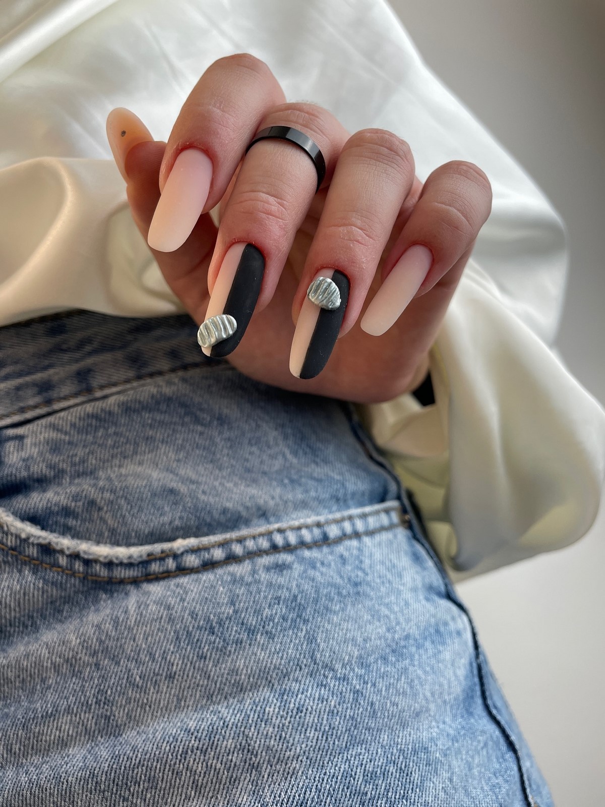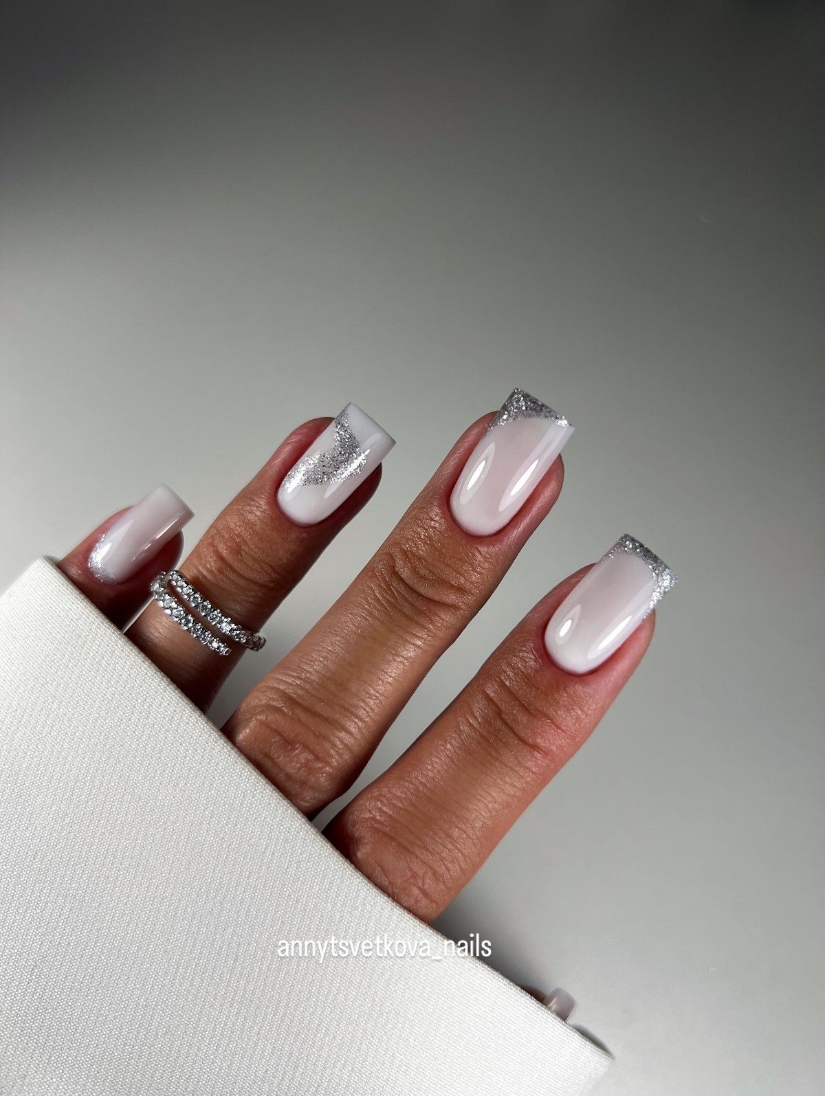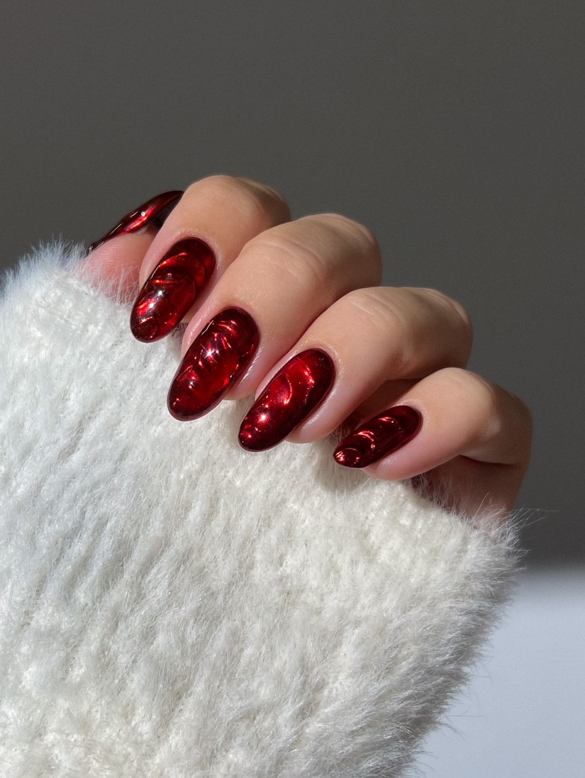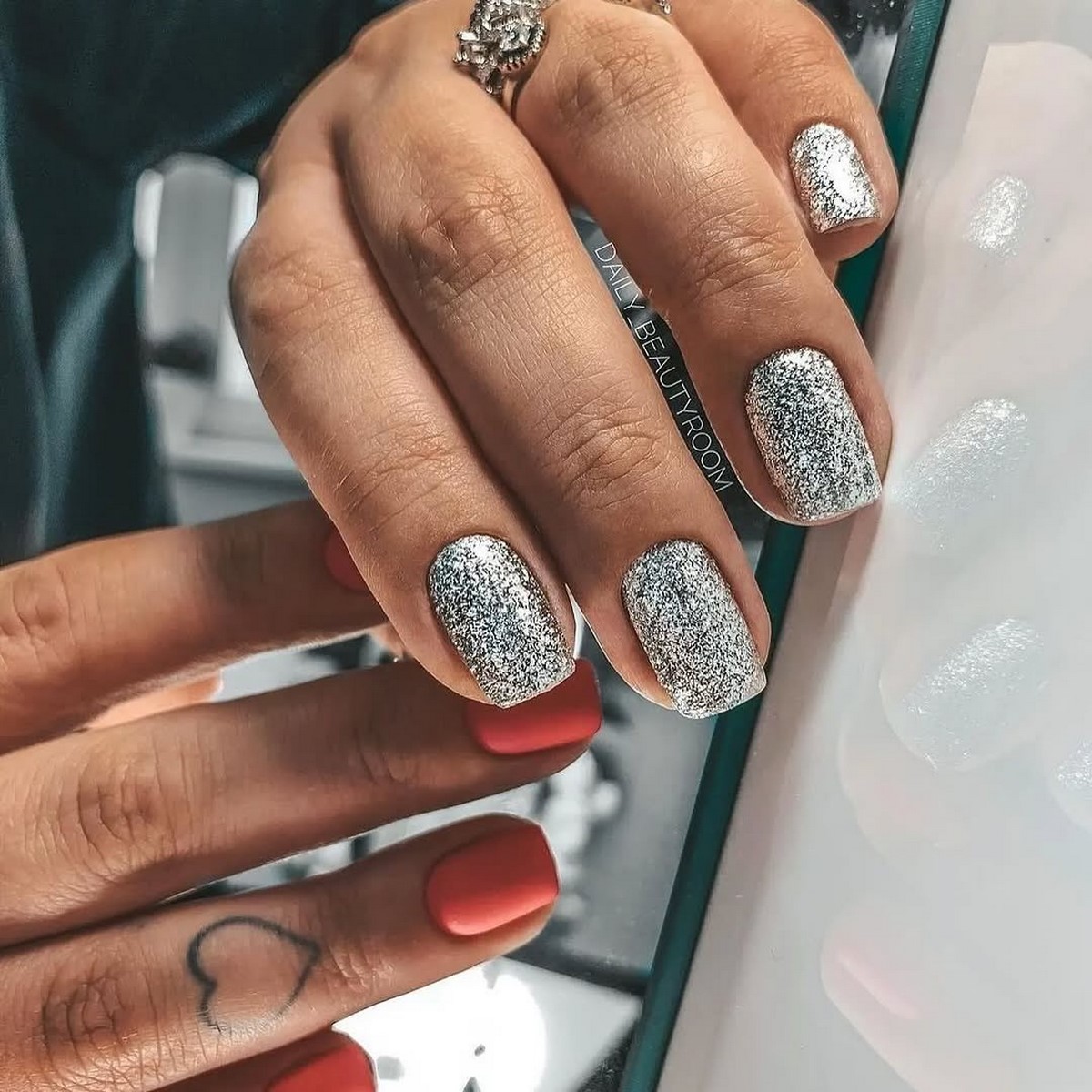 Сочетание красного и серебра — это классика праздничного маникюра, которая в 2026 году интерпретируется через призму минимализма. Глубокий красный оттенок — от алого до винного — становится основой дизайна, а серебро добавляется точечно: в виде тонкой французской линии, геометрических элементов или металлической втирки на одном пальце. Этот контраст создает роскошное и в то же время сдержанное сочетание, идеально вписывающееся как в вечерний наряд, так и в повседневный стиль. Красно-серебряный маникюр подчеркивает уверенность и хороший вкус обладательницы.