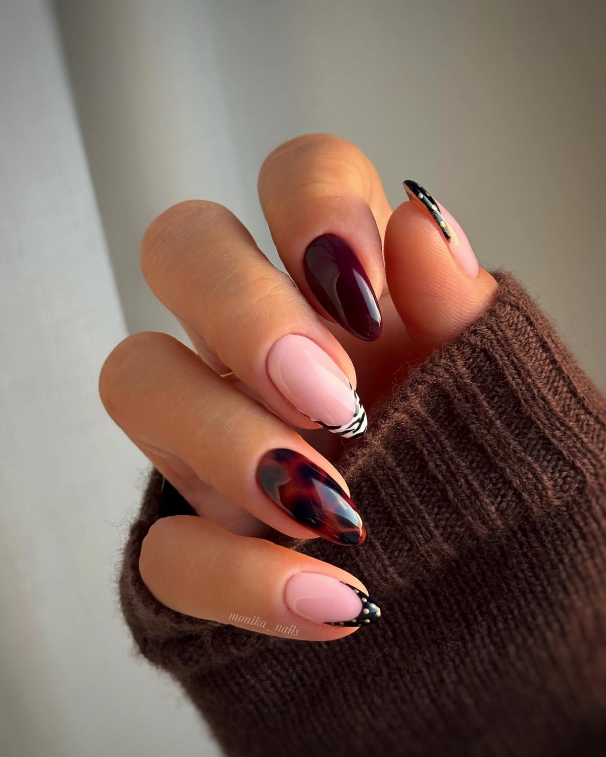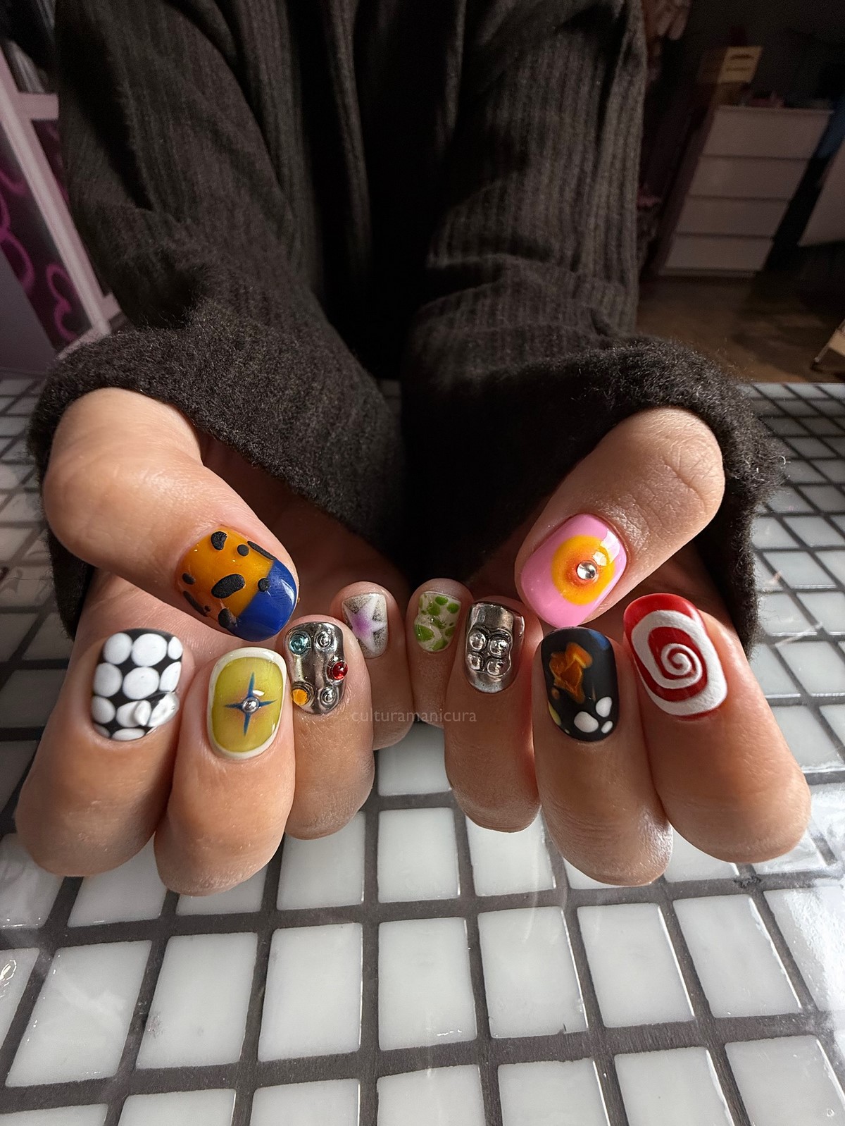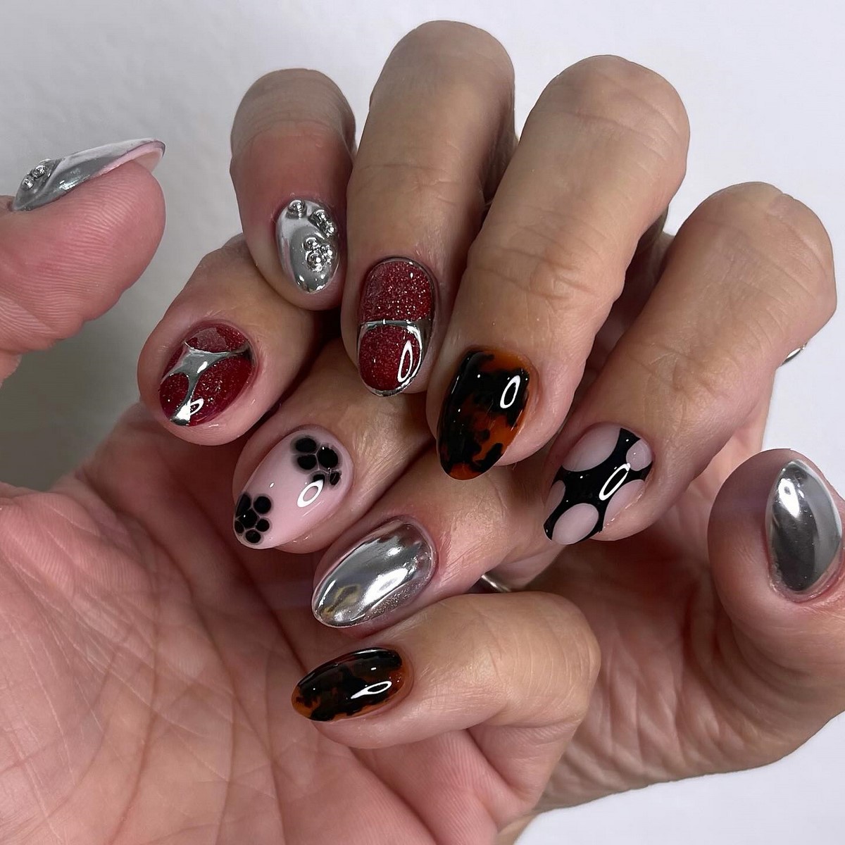 Mix and Match — это нейл-арт без правил. Разные принты, оттенки и текстуры на каждом ногте создают модную мозаику, где царит творческая свобода.