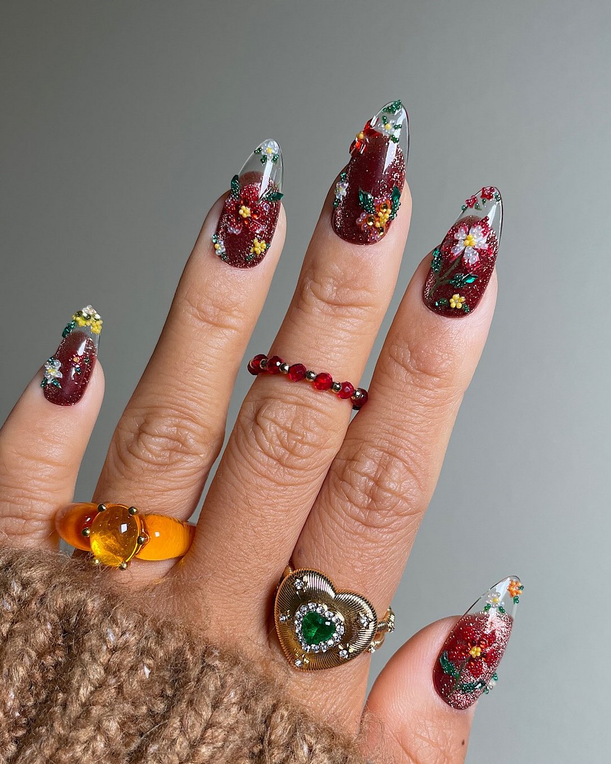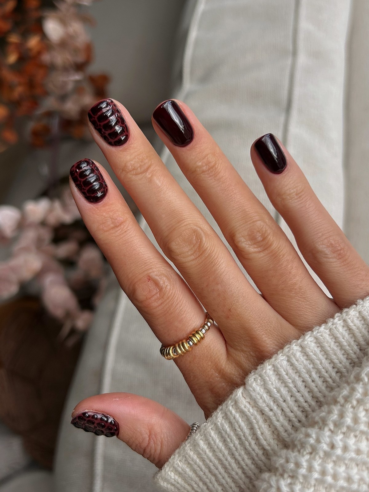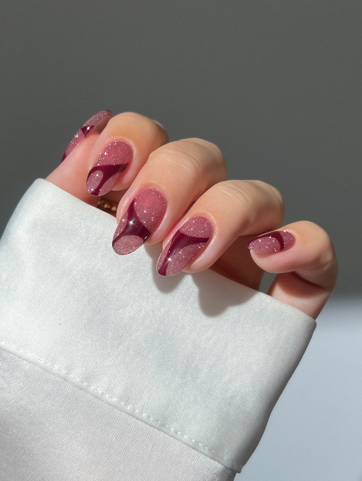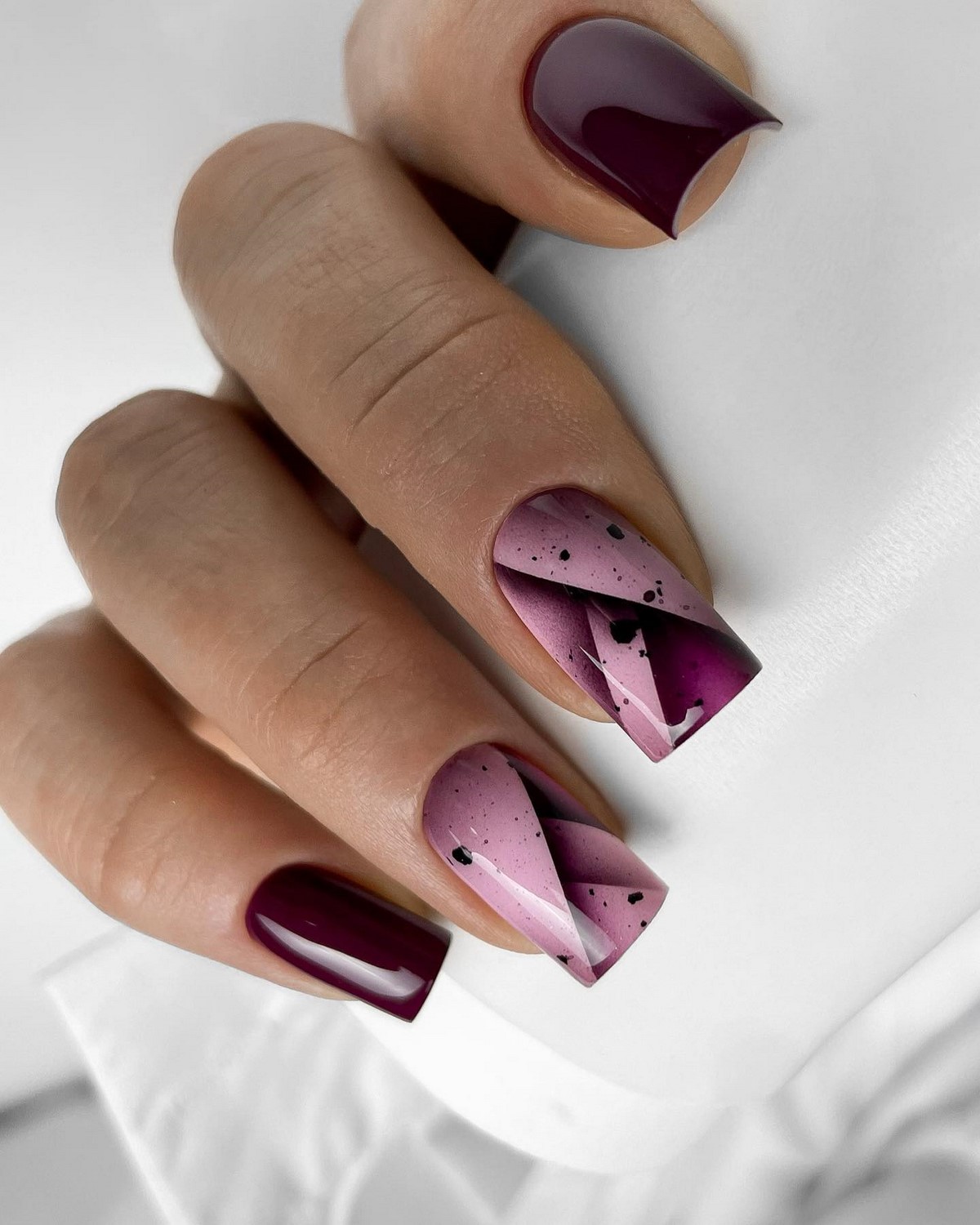 Особенно популярны комбинации глянца и матовости, когда блестящие элементы мягко выделяются на бархатной основе. Ногти с объемными текстурами выглядят дорого и стильно, особенно в глубоких оттенках бордо, индиго или графита.