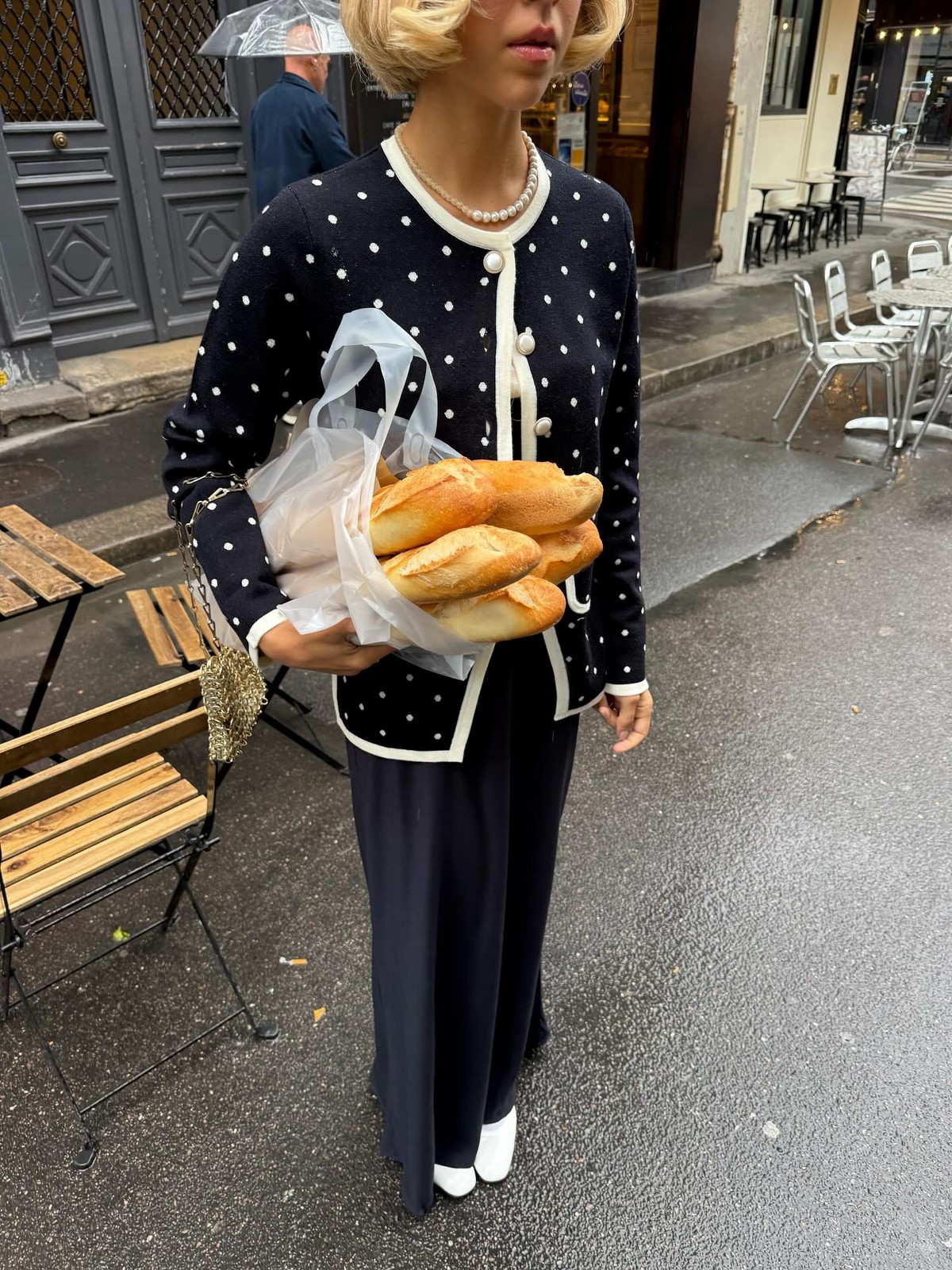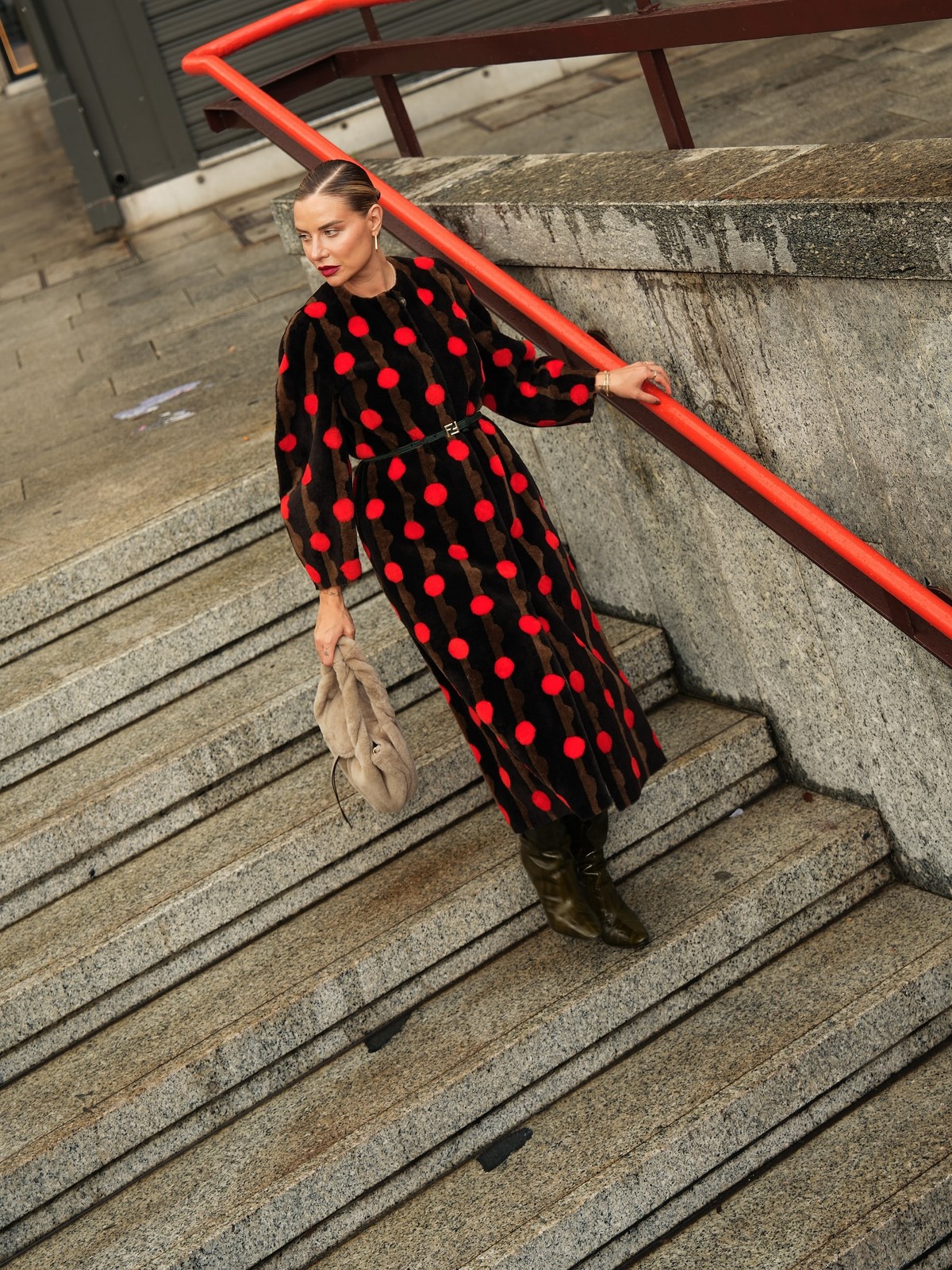 Принт в горох возвращается как символ женственности и игривости. В зимних коллекциях он встречается на платьях, блузах и даже пальто. Крупный горох добавляет ретро-шарм, а мелкий — утонченность и мягкость. Этот мотив легко вписывается как в повседневные, так и в вечерние луки.